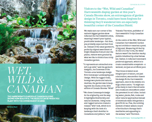 A feature by Nancy Payne explores the garden's design, including a sidebar about the Bateman Forest Trail, the show's main garden feature which intertwined with Harrowsmith's space. "The little streams that Genoscape built were flowing from our garden and their garden together," said Thornton. "You could walk from one space into the other space. It was absolutely beautiful."