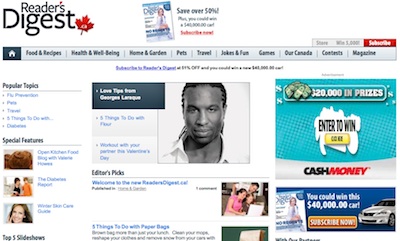 Designed on the Drupal platform, the visual side of the redesigns were completed in-house, with the technical aspects created in partnership with Montréal-based TP1, says Reader’s Digest vice president, digital media and strategic partnerships Yann Paquet. Changes on the sites include new Jokes and Fun sections, and expanded areas for Food and Recipes and Health and Well Being.