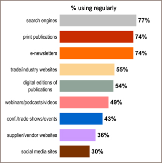 The survey by Readex Research garnered 2,095 responses, and shows professionals turn to search engines most often (77% of respondents use it regularly) while print magazines related to their industry/profession rank second along with e-newsletters (74%).